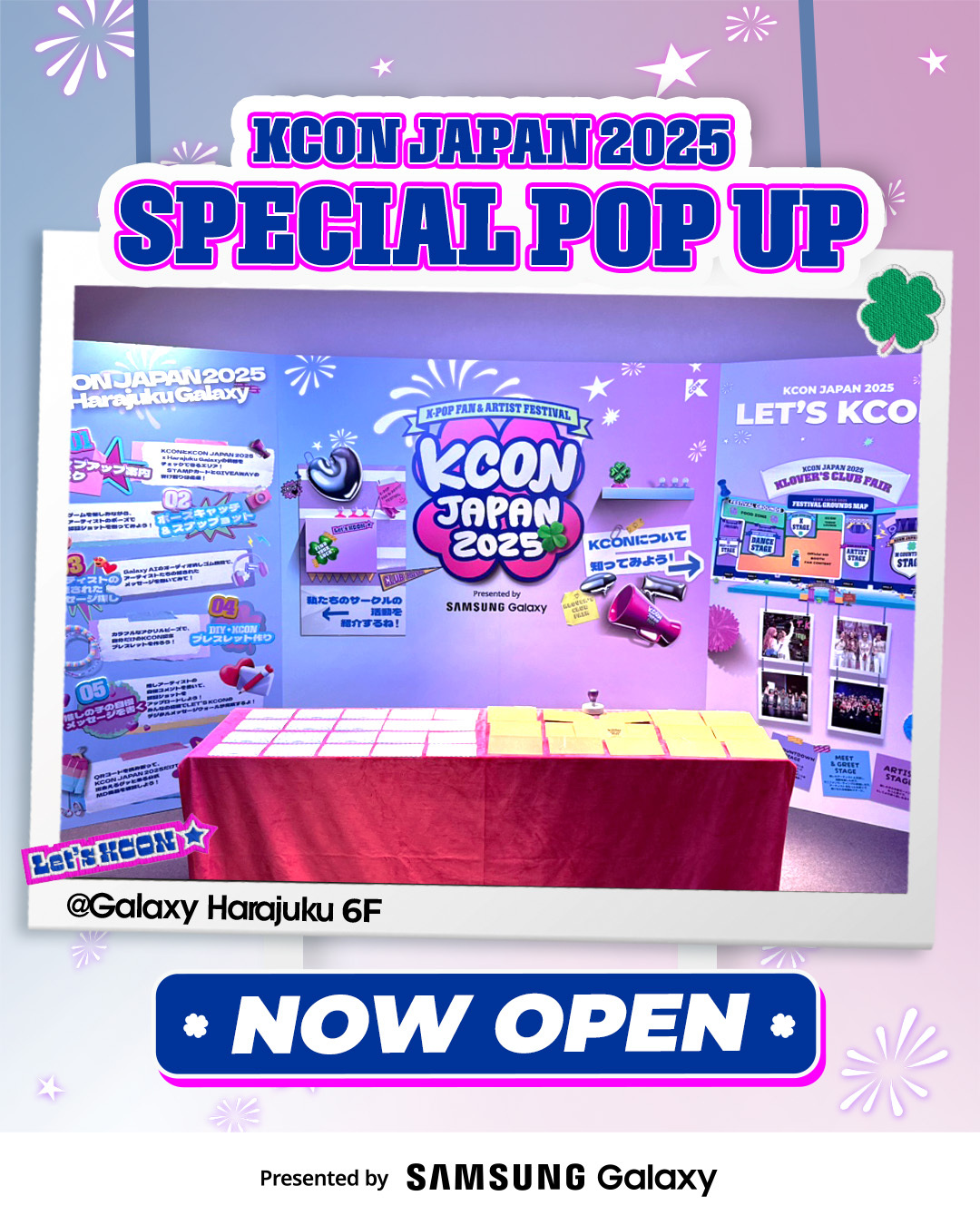 また、4月29日(火) から「KCON JAPAN 2025 X Galaxy Harajuku」コラボポップアップが東京・渋谷のGalaxy Harajukuにて開催中です。アーティストのポーズを真似して楽しむ「フォトクラブ」、アーティストの隠れたメッセージが聞ける「オーディオクラブ」などを通じて、いち早く「KCON JAPAN 2025」を体験することができます。